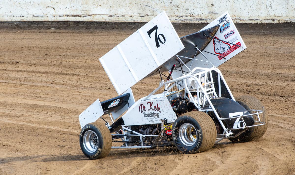 The Oudman Motorsports #7o has been the car to beat, no matter the driver in the Cook Road Shell Sportsman Sprints. With Chase Goetz off on other commitments, Tyler Thompson, the Harrisburg, OR teenager, drew driving duties and scored the victory, inheriting the lead on lap 15 after race leader Justin Youngquist tangled with cars who were slowing on the back straightaway as Brett McGhie’s ride caught fire. Thompson was too strong on the ensuing restart, driving away from runner up Kelsey Carpenter and third place Michael Bollinger to take the win in his very first Skagit Speedway appearance. On the year, the Oudman Motorsports car has won all three main events and led 61 of the 75 A Main laps. Carpenter won the Cooks General Contracting Fast Time award. Heat wins went to Malachi Gemmer and Jayme Barnes.